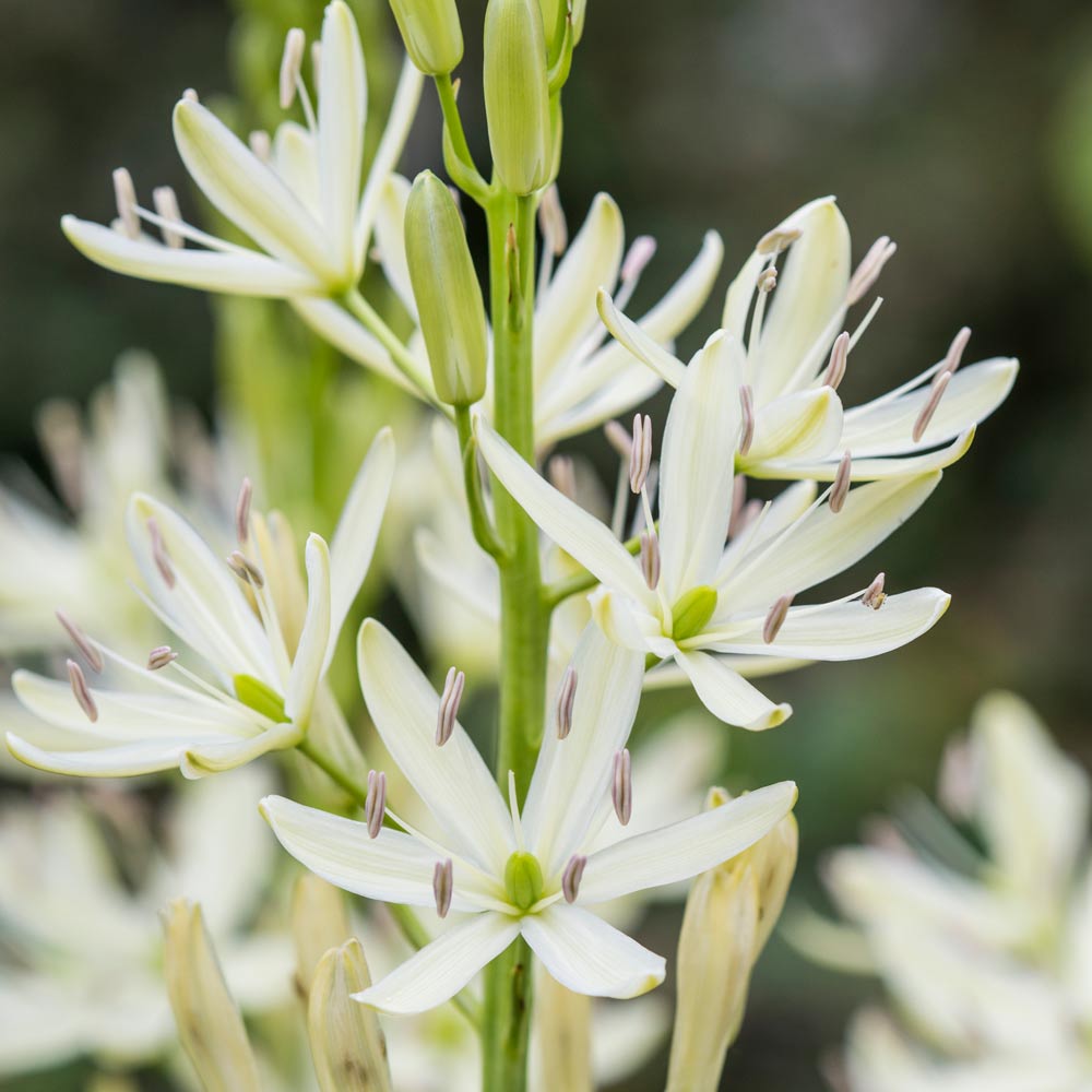 Camassia is a small American genus of bulbous plants that produce long, straight stems bearing dozens of small, star-shaped flowers in varying shades of blue, cream, and white. Unlike most bulbs, Camassias are quite tolerant of winter wet and will prosper in damp sites where Tulips and Lilies will not survive. Camassias flower in late spring -- a crucial time for the garden -- most Daffodils are gone, but the full glory of June perennials still lies ahead. The leaves of Camassias turn yellow and disappear in summer, making room for annuals and other plants that will gladly fill in for the rest of the season