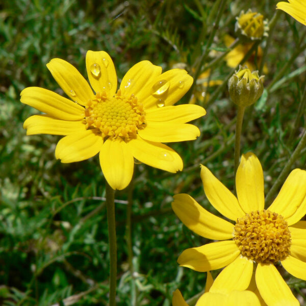 The flowers are yellow and composite, looking much like true sunflowers, and sometimes grow to about 5 cm (2 in) wide. Both the (8–12) ray and disk flowers are yellow, with one flower head on each flowering stalk. The flower heads have 6–14 rays, which are darker towards the base, and several disk flowers. They bloom from May to August. The seeds have scales at the tip.